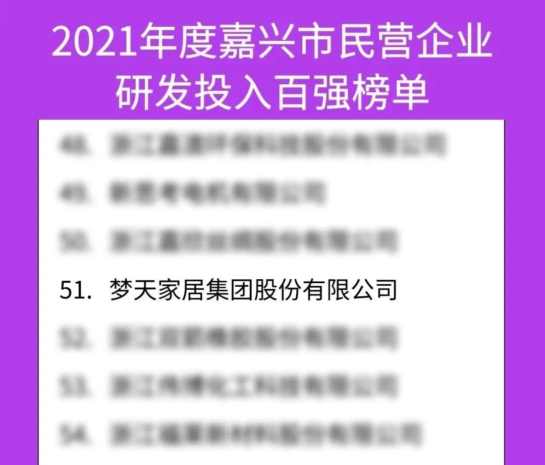 近日,嘉兴市场监管局、嘉兴市工商联共同发布“2021年度嘉兴市民营企业利润100强、研发投入100强、外贸出口100强和社会贡献100强”四份榜单。其中,梦天家居在技术研发方面突出表现,荣登上榜!