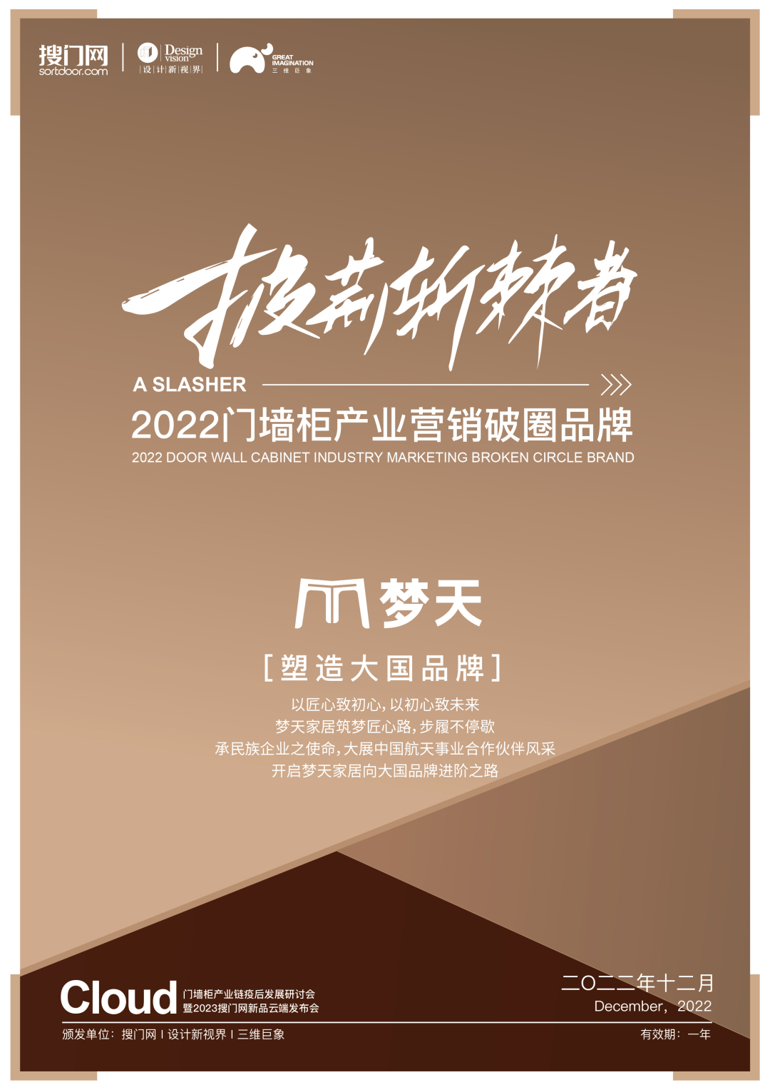 日前,由搜门网携手三维巨象、设计新视界、木文化创意产业国家创新联盟联合举办的《重新上场必须漂亮——门墙柜产业链疫后发展研讨会暨2023搜门网新品云端发布会》圆满举行。会上,为表彰和鼓励不畏艰难、勇于开拓的优秀行业代表品牌,特别设立《披荆斩棘者——2022年度门墙柜产业营销破圈品牌》奖项,并举行隆重颁奖。