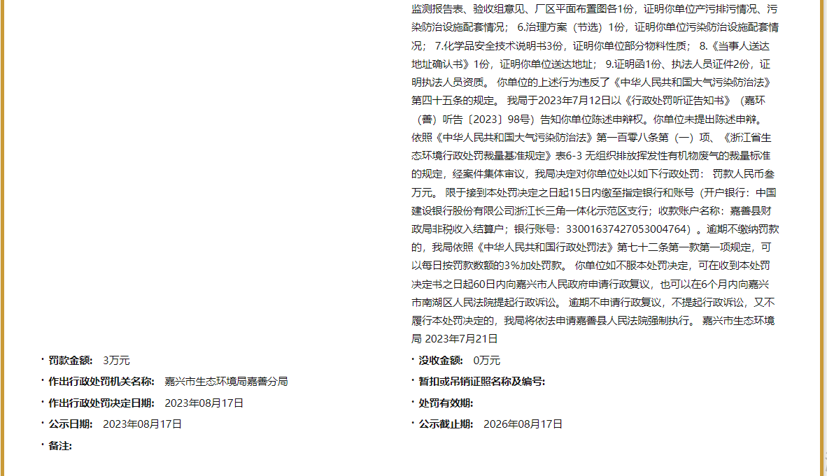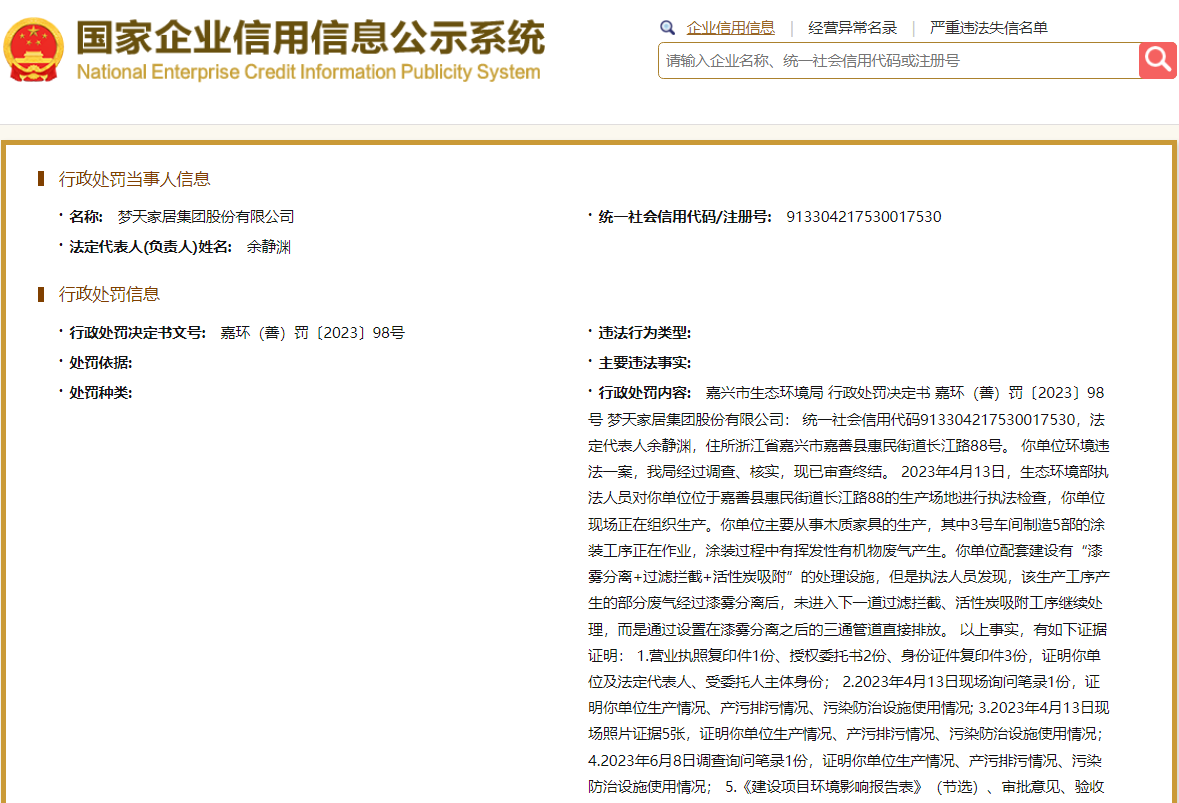 8月21日,梦天家居集团股份有限公司(以下简称“梦天家居”)近日新增一条行政处罚记录,处罚单位为嘉兴市生态环境局嘉善分局,行政处罚决定文书号为嘉环(善)罚﹝2023﹞98号。
