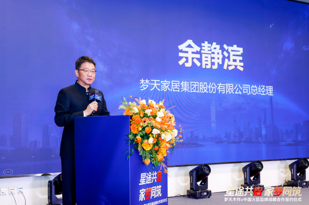 梦天家居 总经理余静滨在致辞中表示,此次合作是 梦天家居 与中国火箭公司科技创新与品牌力量的深度融合。他代表 梦天家居 向中国火箭公司为航天事业做出的贡献致以崇高敬意,并对到场嘉宾表示感谢。