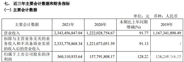 报告期内公司实现营业收入 2,343,456,847.04 元,比上年同期增加 91.77%,利润总额 421,368,440.11 元,归属于母公司所有者的净利润 360,110,935.64 元,较上年同期增加 128.22%,归属于上市公司股东的净资产 2,573,213,827.58 元,较去年同期增加 13.91%。