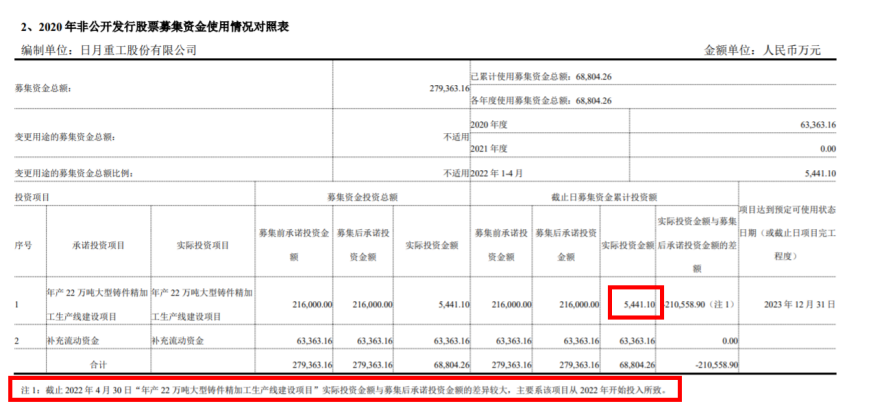 虽然2020年,日月股份已完成前次非公开募资,但“年产22万吨大型铸件精加工生产线建设项目”实际从2022年才开始投入,截至2022年4月30日,该项目实际投资额仅为5441.10万元。这一情形也引起了发行监管部的关注,日月股份被要求说明“年产22万吨大型铸件精加工生产线建设项目”投入进度是否慢于预期;上述项目后续预计投入计划和完工时间,以及此次募集资金是否具有必要性和合理性,是否过度融资。