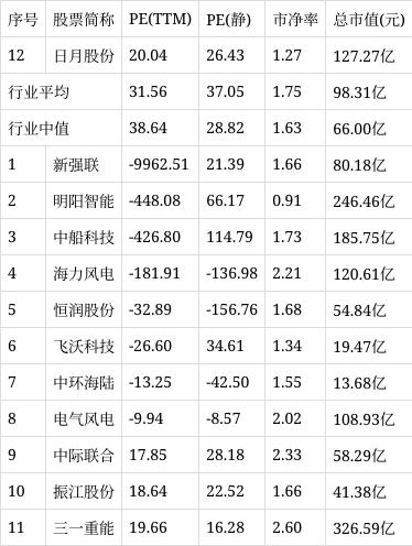 从行业市盈率排名来看,公司所处的风电设备行业市盈率平均31.56倍,行业中值38.64倍,日月股份排名第12位。