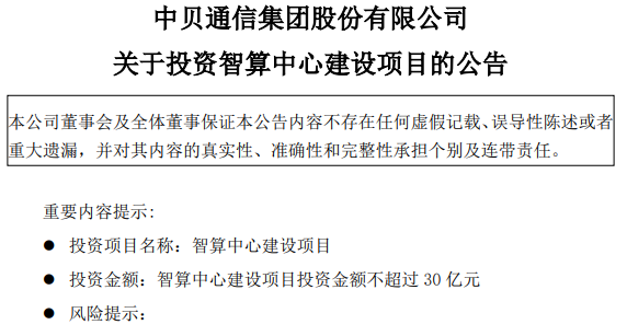 2024年2月6日,中贝通信又公告拟投资智算中心建设项目,项目拟在青海、山西等多地建设算力集群,投资总金额不超过30亿元,建设周期预计为2年。