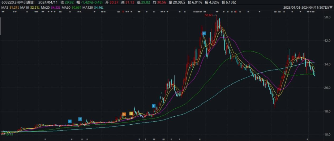 乘着算力概念股的风潮,主要为政府和行业客户提供基于云主机的算力、存储、云服务和解决方案的中贝通信,在2023年迎来股价的暴涨,一度从10元涨至50元,而此后便呈现震荡下跌趋势。