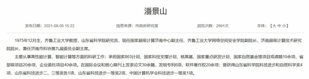 虽然合作方与国家超级计算济南中心无股权关系,但“V观财报”(微信号ID:VG-View)注意到,在济南市人民政府政策研究室专家库中,有于2021年发布的同样名为潘景山的相关介绍:潘景山,1975年12月生,齐鲁工业大学教授,山东省科学院研究员,现任国家超级计算济南中心副主任、齐鲁工业大学网络空间安全学院副院长、济南超级计算技术研究院院长。