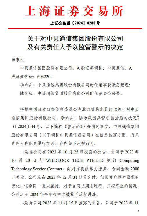 上交所网站11日披露关于对中贝通信集团股份有限公司(简称“中贝通信”)及有关责任人予以监管警示的决定。