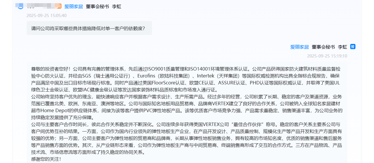 爱丽家居与VERTEX的合作关系合作多年。爱丽家居主要为欧美等境外PVC弹性地板贸易商、品牌商提供ODM产品。李虹称,公司与国际知名地板用品贸易商、品牌商VERTEX建立了良好的合作关系,公司被纳入全球知名家居建材超市HomeDepot的供应链体系,间接为该等客户提供PVC弹性地板产品。“从产业链形态来看,公司作为弹性地板生产商与中间贸易商、终端销售商形成了交互的合作方式。三方在产品物流、产品技术流、市场信息流等方面形成了持久稳定的协同关系。”