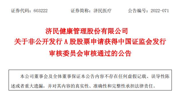 济民健康管理股份有限公司(简称“济民医疗”,603222.SH)昨晚发布关于非公开发行A股股票申请获得中国证监会发行审核委员会审核通过的公告。2022年10月31日,中国证券监督管理委员会(以下简称“中国证监会”)发行审核委员会对济民医疗非公开发行A股股票的申请进行了审核。根据审核会议结果,公司本次非公开发行A股股票的申请获得通过。