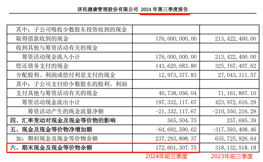 合并现金流量表(2024年1—9月),图片来源:济民健康2024年三季报
