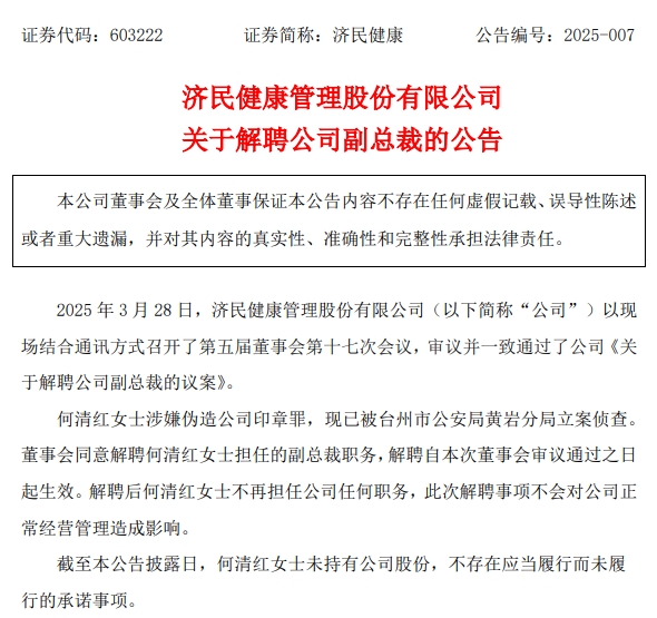 值得注意的是,济民健康于26日披露,何清红涉嫌伪造公司印章罪,现已被台州市公安局黄岩分局立案侦查。
