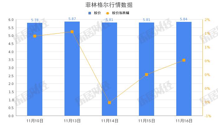 截至11月16日,菲林格尔(603226.SH)股价收盘报5.81元,涨0.52%,总市值20.76亿元。