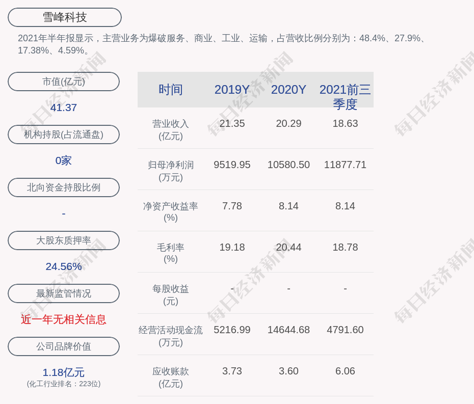 2021年半年报显示,雪峰科技的主营业务为爆破服务、商业、工业、运输,占营收比例分别为:48.4%、27.9%、17.38%、4.59%。