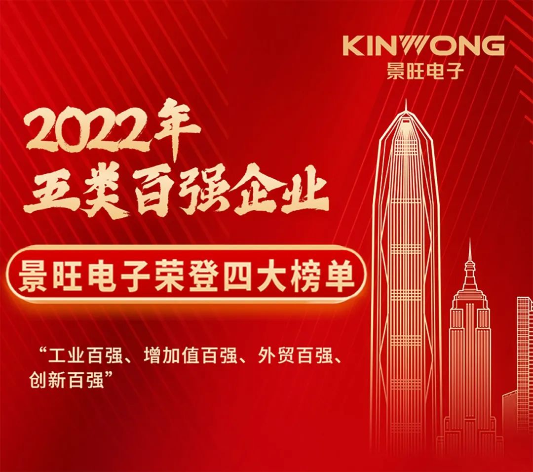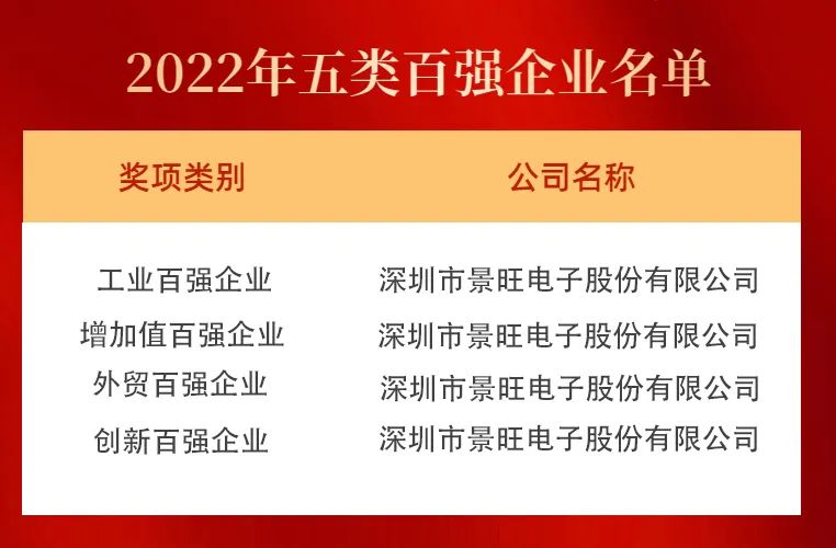 2023年1月6日,宝安区工信局公布了工业、增加值、服务业、外贸、创新五类百强企业名单,景旺电子荣列工业百强、增加值百强、外贸百强、创新百强等多项榜单。