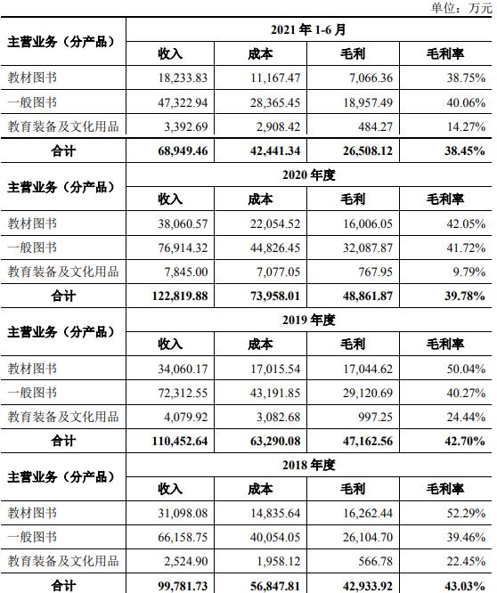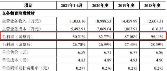 招股书披露,2020年秋季学期起,教育厅将除内蒙古教育出版社之外的其他出版社的义务教育阶段免费教材由原分开结算模式,调整为与内蒙新华全额结算模式,相对应的成本费用上升,从而导致义务教育阶段免费教材业务的毛利率大幅下滑,由2018年、2019年的95.11%和87.08%下滑至2020年与2021年上半年的62.77%和50.21%。