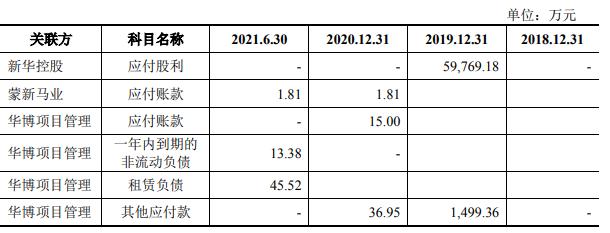 通过查询招股书发现,内蒙新华的资产负债率以及流动比率之所以在2019年发生较大变化,主要是由于2019年内蒙新华发生了一大笔关联交易,其向新华控股计提应付股利5.98亿元以及应付华博项目管理1499.36万元,导致流动负债大幅增加。