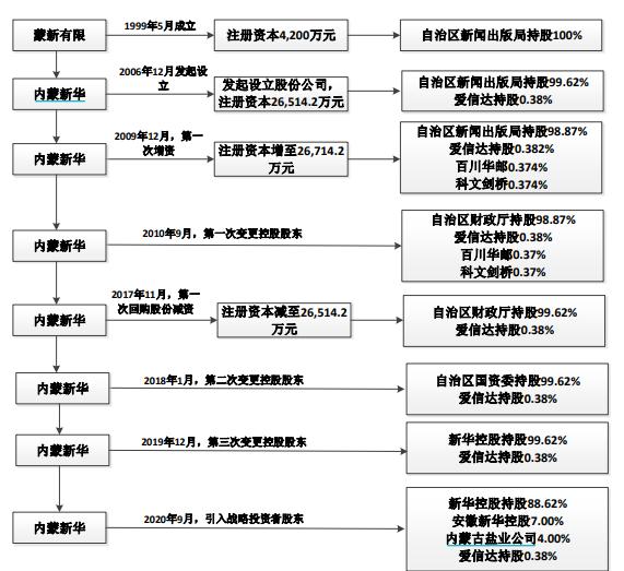2010年9月,内蒙新华第一次变更控股股东,实际控制人由内蒙古自治区新闻出版局变更为内蒙古自治区财政厅,持股比例为98.87%。2018年1月,内蒙新华第二次变更控股股东,内蒙古自治区国资委成为实际控制人,持股比例为99.62%。2019年12月,内蒙新华第三次股权变更,新华控股成为实际控制人,持股比例为99.62%。