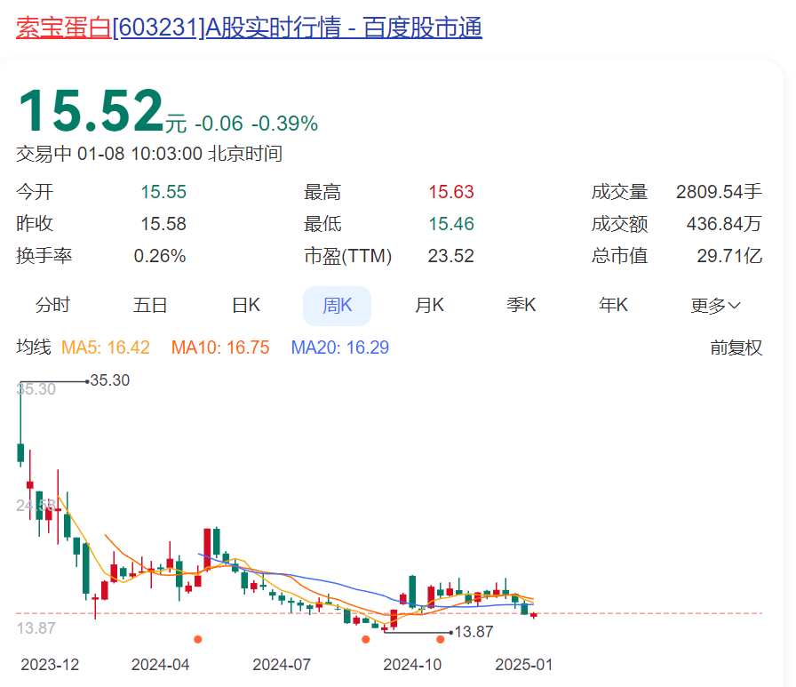 更为严峻的是,公司股价也出现了破发现象。索宝蛋白的发行价为21.29元/股,而当前股价已经跌至远低于发行价的水平。
