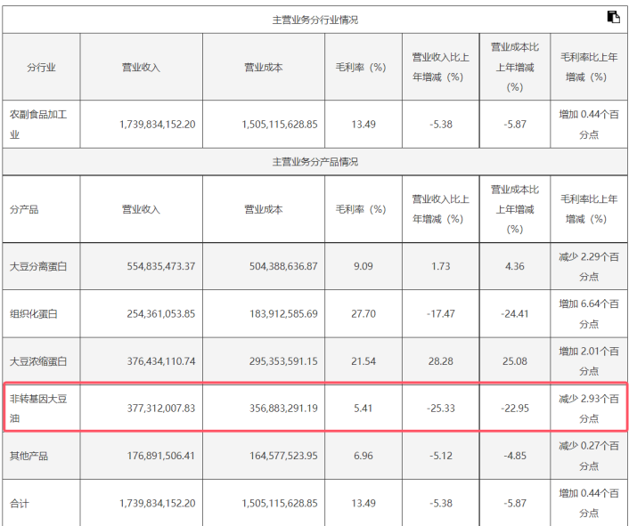 具体来看,2023年公司的大豆分离蛋白、大豆浓缩蛋白业务收入虽然有所增长,但其他业务收入均出现下滑。同时,主要产品的毛利率也出现了不同程度的下降,其中非转基因大豆油的毛利率低至5.41%。