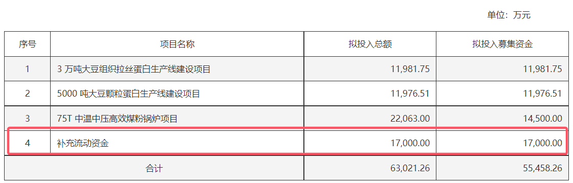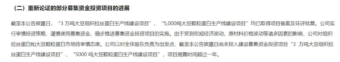 索宝蛋白上市时计划募资5.55亿元,用于年产3万吨大豆组织拉丝蛋白生产线建设项目等多个项目。然而,令人意想不到的是,这些项目在上市后竟然被搁置了。公司解释称,这是由于受到宏观经济波动、原材料价格波动等诸多因素的影响,但这一说法并未能完全消除市场的质疑。