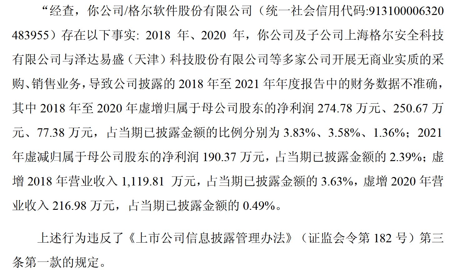据格尔软件8月7日公告,公司2018年至2020年虚增归母净利润274.78万元、250.67万元、77.38万元,2021年虚减归母净利润190.37万元;虚增2018年营业收入1119.81万元,虚增2020年营业收入216.98万元。上述占比均低于当期披露金额的4%。