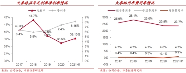 也就是说经营产生的毛利润,有77.35%都花在这三项费用上了,扣除三项费用和税额后,2021年上半年大参林的净利率为8.15%,较2020H下降0.58pp,但整体盈利能力依然维持在高位。