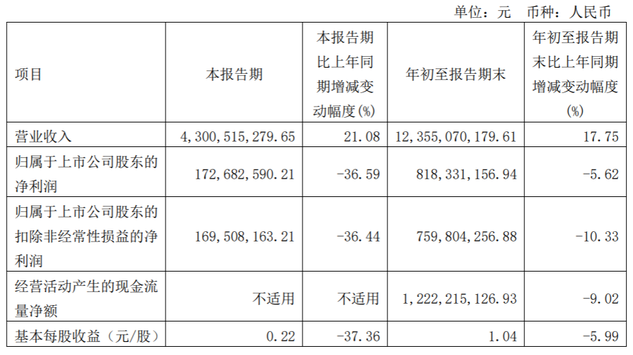 公司前三季度实现营业收入约123.55亿元,同比增长17.75%;前三季度归属于上市公司股东的净利润约为8.18亿元,同比下降5.16%。