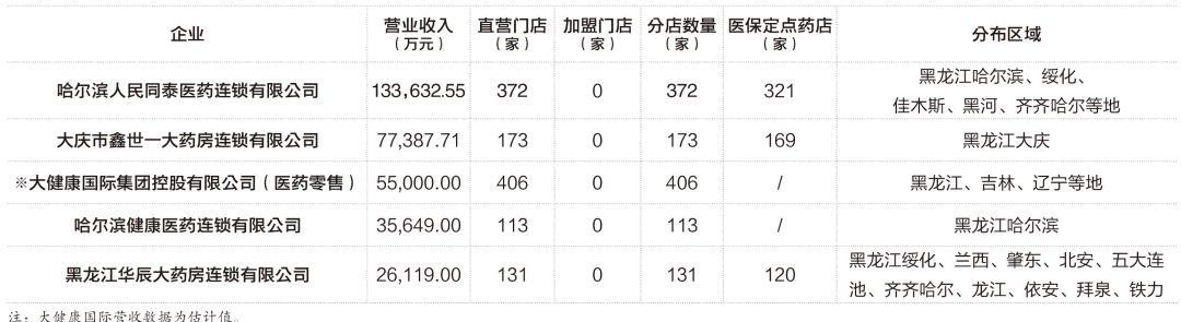 按照《中国药店》征集的样本数据来看,黑龙江连锁Top10企业的门店未超过500家,由于该区域未能形成本土药店巨头,导致了不少省外大型连锁来此“攻城略地”。