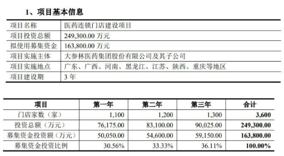 早在今年4月,大参林在公布的募资计划中,就明确表示将在重庆、黑龙江、广东、广西、河南、江苏、陕西等重点地区扩充3600家门店,项目投资总额24.93亿元,建设周期为3年。