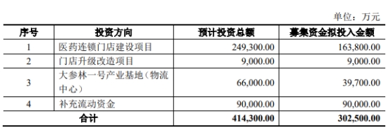大参林于2023年6月14日披露2023年度向特定对象发行A股股票募集说明书(申报稿),公司本次向特定对象发行募集资金总额不超过302,500.00万元(含本数),扣除发行费用后拟用于以下4个项目:医药连锁门店建设项目、门店升级改造项目、大参林一号产业基地(物流中心)、补充流动资金。