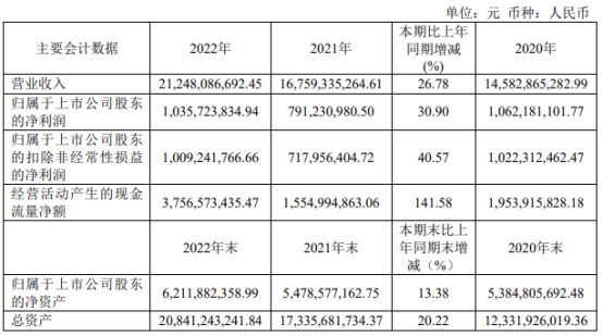 大参林2022年营业收入为212.48亿元,同比增长26.78%;归属于上市公司股东的净利润为10.36亿元,同比增长30.90%;归属于上市公司股东的扣除非经常性损益的净利润为10.09亿元,同比增长40.57%;经营活动产生的现金流量净额为37.57亿元,同比增长141.58%。