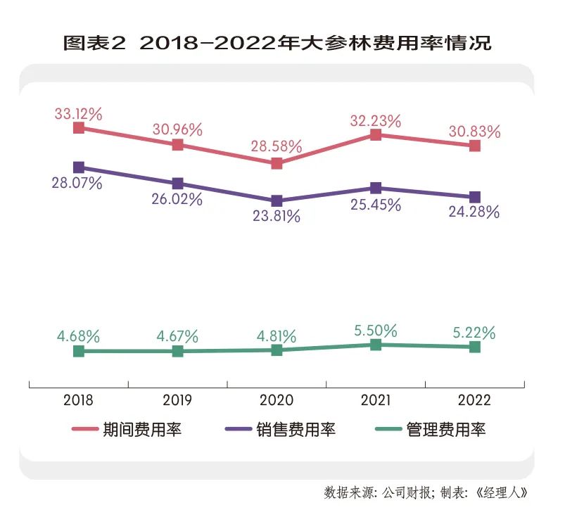 首先,毛利率出现了下降。2018-2022年大参林毛利率分别是41.65%、39.48%、38.47%、38.15%、37.80%,毛利率呈现单边下降走势,五年间毛利率下滑了3.85个百分点,具体来看,营业成本增长速度要快于营业收入增速,近五年营业收入增速为139.84%,同期营业成本增速为155.71%,两者间的差值导致了公司毛利率小幅下降,或许这与公司加速向外扩张有关,自建、并购方式增加的门店较多,短期之内未能形成稳定的经营体系,相比成熟的门店,可能还要增加更多的营销费用。