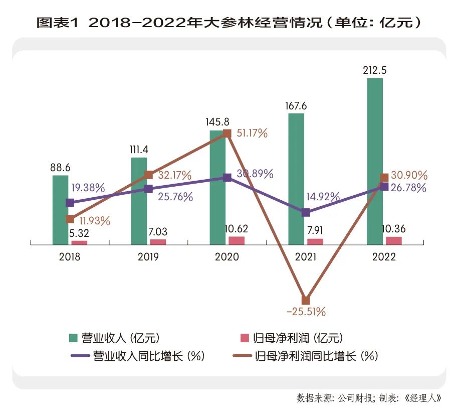 得益于加速铺设门店策略影响,大参林营业收入规模大幅上升,2022年营业收入212.5亿元,归母净利润10.36亿元,相比上市初期,营业收入规模翻了近3倍,归母净利润翻了2.2倍。据天风证券2023年5月9日研报显示,预计2023-2025年,大参林营业收入分别为266.43亿元、327.39亿元、403.17亿元,同比增速分别为25.39%、22.88%、23.15%,归母净利润分别为13.09亿元、16.22亿元、19.81亿元,同比增长26.36%、23.95%、22.10%,随着扩张速度的不断推进以及现有的门店贡献稳定的经营业绩,公司的收入增速也在稳健提升。