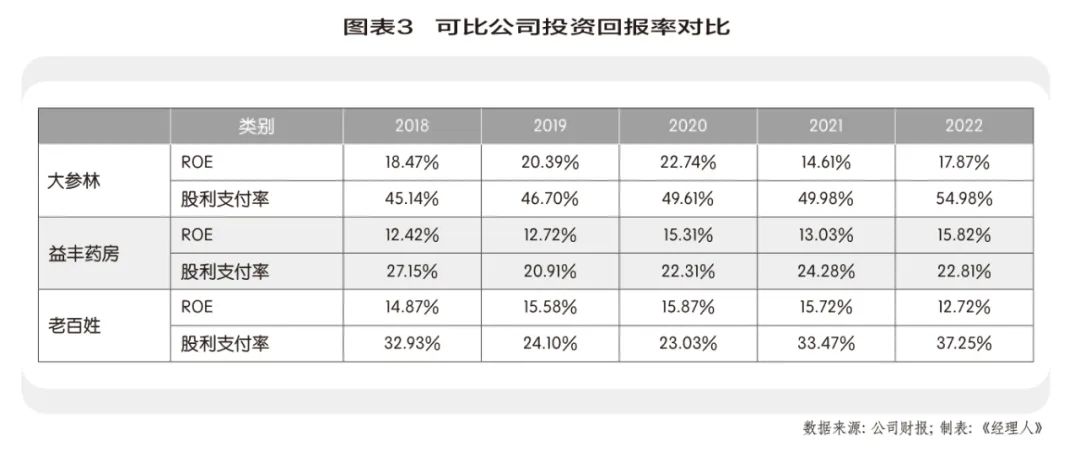 一般而言,股东或投资者会关注上市公司的ROE(净资产收益率)和股利支付率指标,即关注一家公司的赚钱能力和是否愿意与股东或投资者共享公司发展过程中的收益。如图表3所示,大参林近五年ROE虽然震荡中出现了回落,但其平均值仍旧可以达到18.81%,属于较优回报率区间,2022年ROE为17.87%,相比2021年出现了改善,有望重新回归至20%水平区间上。