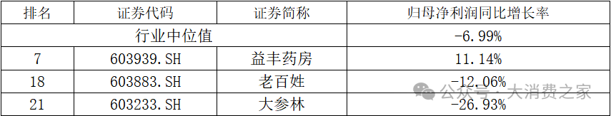 但竞争是行业内所有企业共同面临的问题,在A股31家医药商业行业中,大参林的归母净利润同比增长率-26.93%仅排在第21位,行业中位值为-6.99%,大参林的盈利增速远低于行业平均水平,也显著低于主要竞争对手益丰药房的11.14%和老百姓的-12.06%。说明大参林可能在成本控制、运营效率提升、产品结构优化等方面存在短板,需要进一步改善和提升。