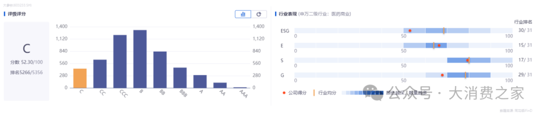 近年来资本市场越来越重视ESG评价,大参林在此方面也遭棒喝,不久前华证指数公布的新一期ESG评级结果显示,大参林的评级从上期的CCC下调至C。52.30的低分在医药商业行业的31家企业中排名第30,在A股5356家上市公司中排名第5266。