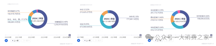 图5 从左至右依次为大参林、益丰药房、老百姓的营业收入按地区分类图