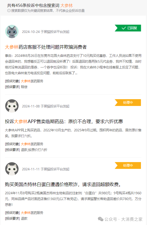 在黑猫投诉平台,针对大参林投诉竟然多达456条,其中不乏大量因价格、服务、质量等问题对公司或品牌的质疑。可见公司在追求门店数量的同时,对门店经营管理的质量缺乏足够的掌控力,对客户的服务也不够重视。长此以往,恐将失去消费者的信任。