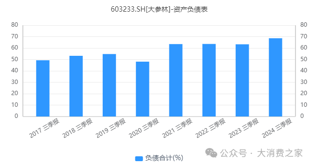 财报显示,大参林的资产负债率从上市以来年年攀升,目前处于历史最高位67.11%。这一水平在31家上市医药商业企业(同花顺行业二级分类)中位居第5,高于行业中位值62.95%。