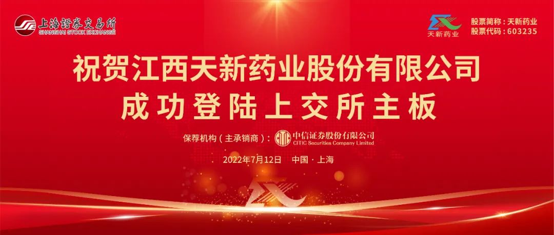 2022年7月12日,江西天新药业股份有限公司(证券代码:603235)在我所上市。