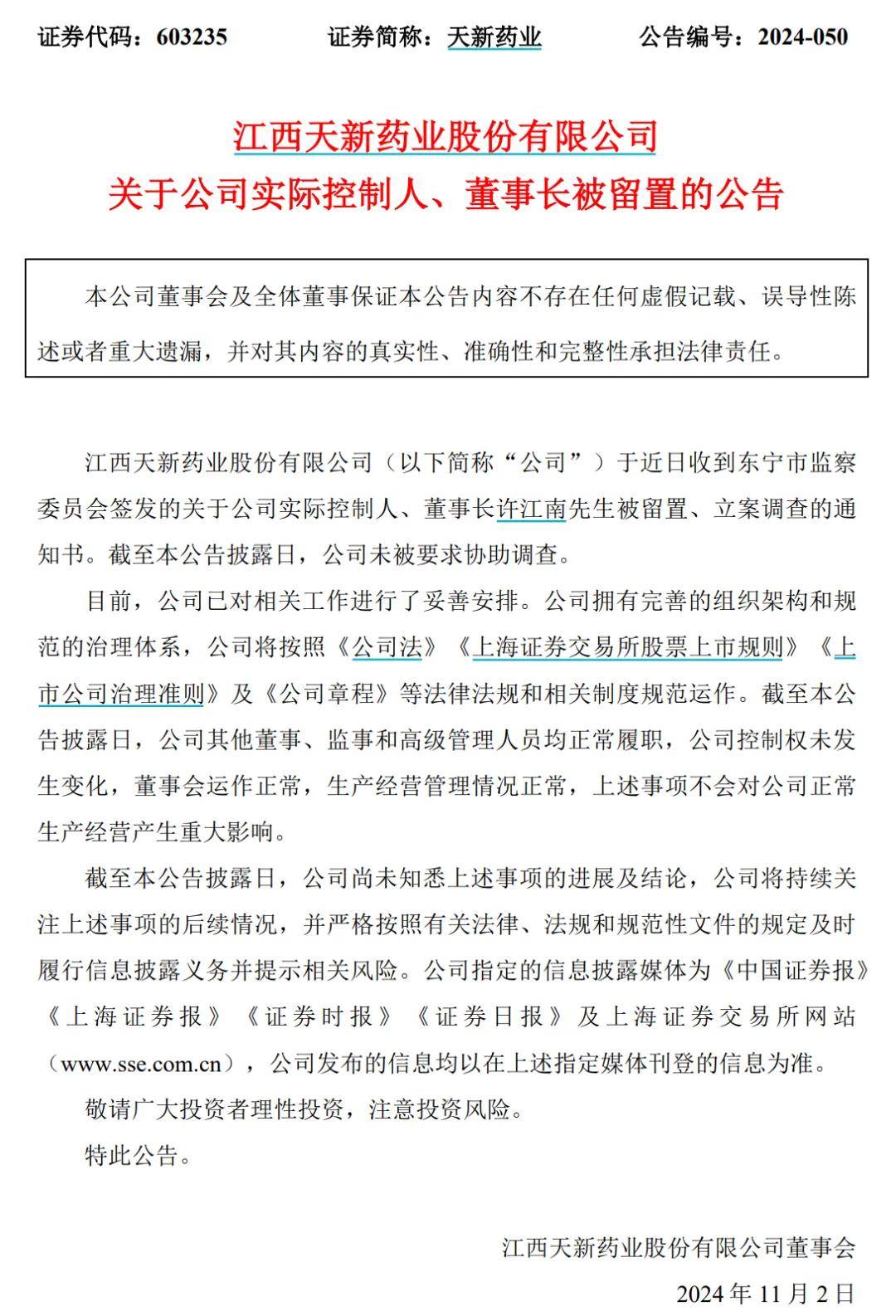 近日,天新药业发布重要公告,披露公司实际控制人及董事长许江南已被东宁市监察委员会采取留置措施,并立案调查。值得注意的是,截至公告发布之时,天新药业并未接到任何要求协助调查的通知。