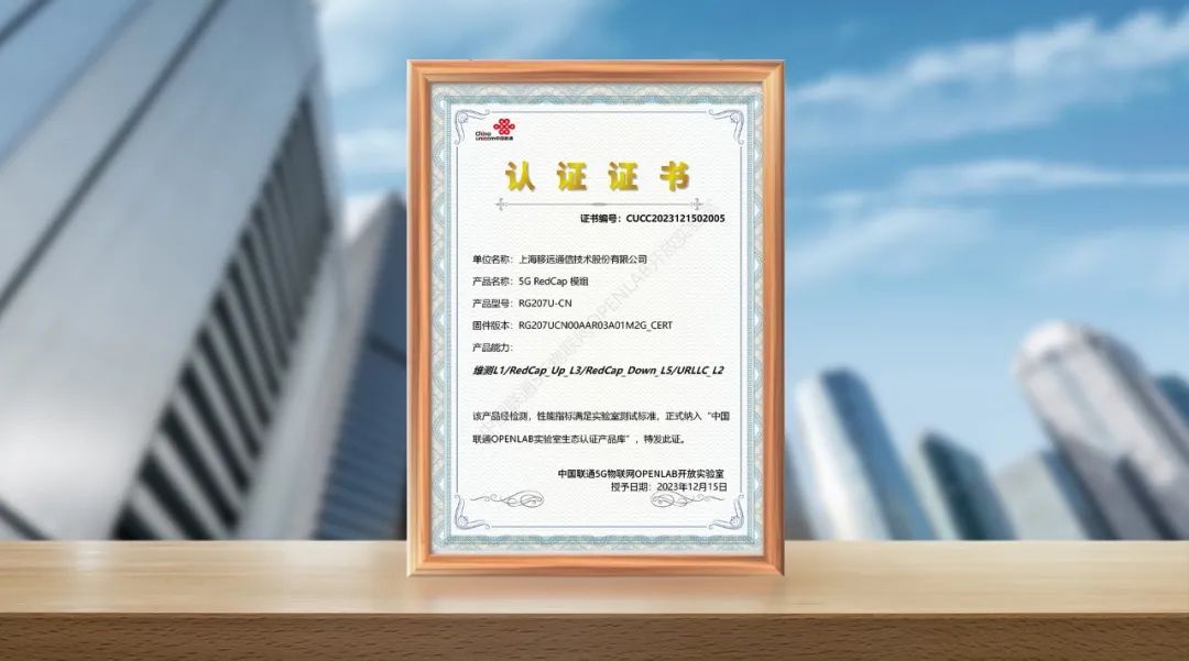 近日,移远通信联合紫光展锐在中国联通5G物联网OPENLAB开放实验室,完成了RedCap模组RG207U-CN端到端测试验收,并获颁认证证书。移远通信RG207U-CN成为业内率先通过联通OPENLAB认证的紫光展锐RedCap芯片平台的模组。