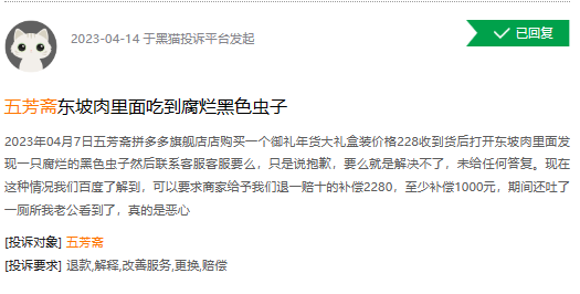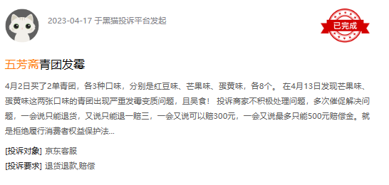 浏览黑猫投诉,截至2023年5月11日21时,“五芳斋”相关投诉3809条投诉,反映问题大多集中在:产品有异物、变质发霉、售前售后服务等方面。