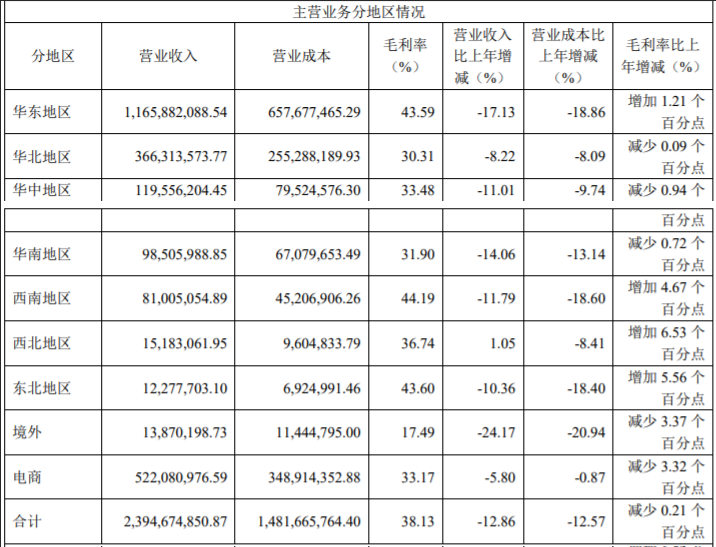 但走出华东,只有华北和华中地区的营收额分别到达了3.66亿和1.19亿,其余均在千万级别。