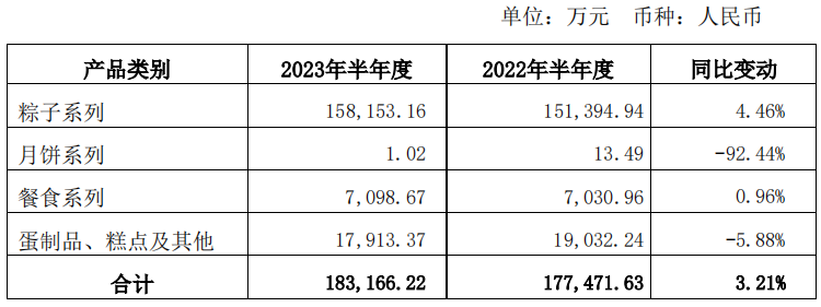 分产品来看,粽子系列的营收仍占整体营收的绝对比重,上半年营收15.81亿元,同比增长4.46%;月饼系列营收则出现了大幅下降,相较去年同期减少了92.44%。