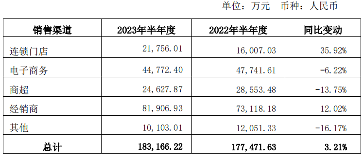 销售模式方面,营收占比排名第一的仍然是经销商,上半年共营收8.19亿,同比增长12.02%;占比排名第二的电子商务营收则出现了小幅回落,营收4.48亿,较去年同期减少6.22%;第三名的商超渠道营收也不及去年同期,减少了13.75%。