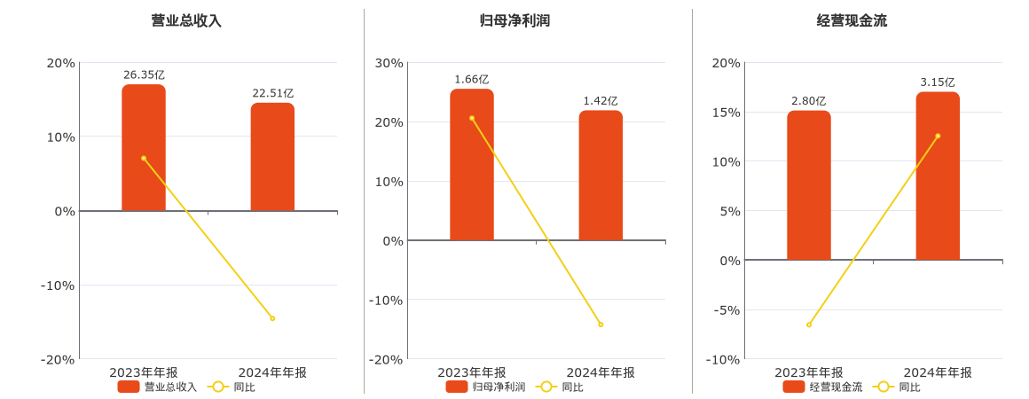 公司营业总收入为22.51亿元,在已披露的同业公司中排名第8,较去年同报告期营业总收入减少3.84亿元,同比较去年同期下降14.57%。归母净利润为1.42亿元,在已披露的同业公司中排名第7,较去年同报告期归母净利润减少2359.63万元,同比较去年同期下降14.24%。经营活动现金净流入为3.15亿元。
