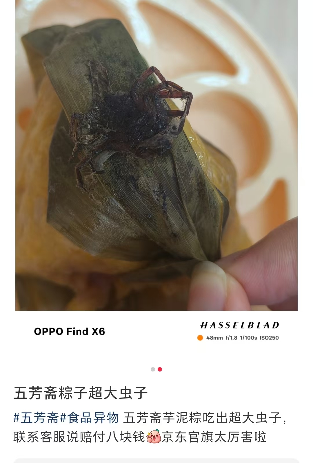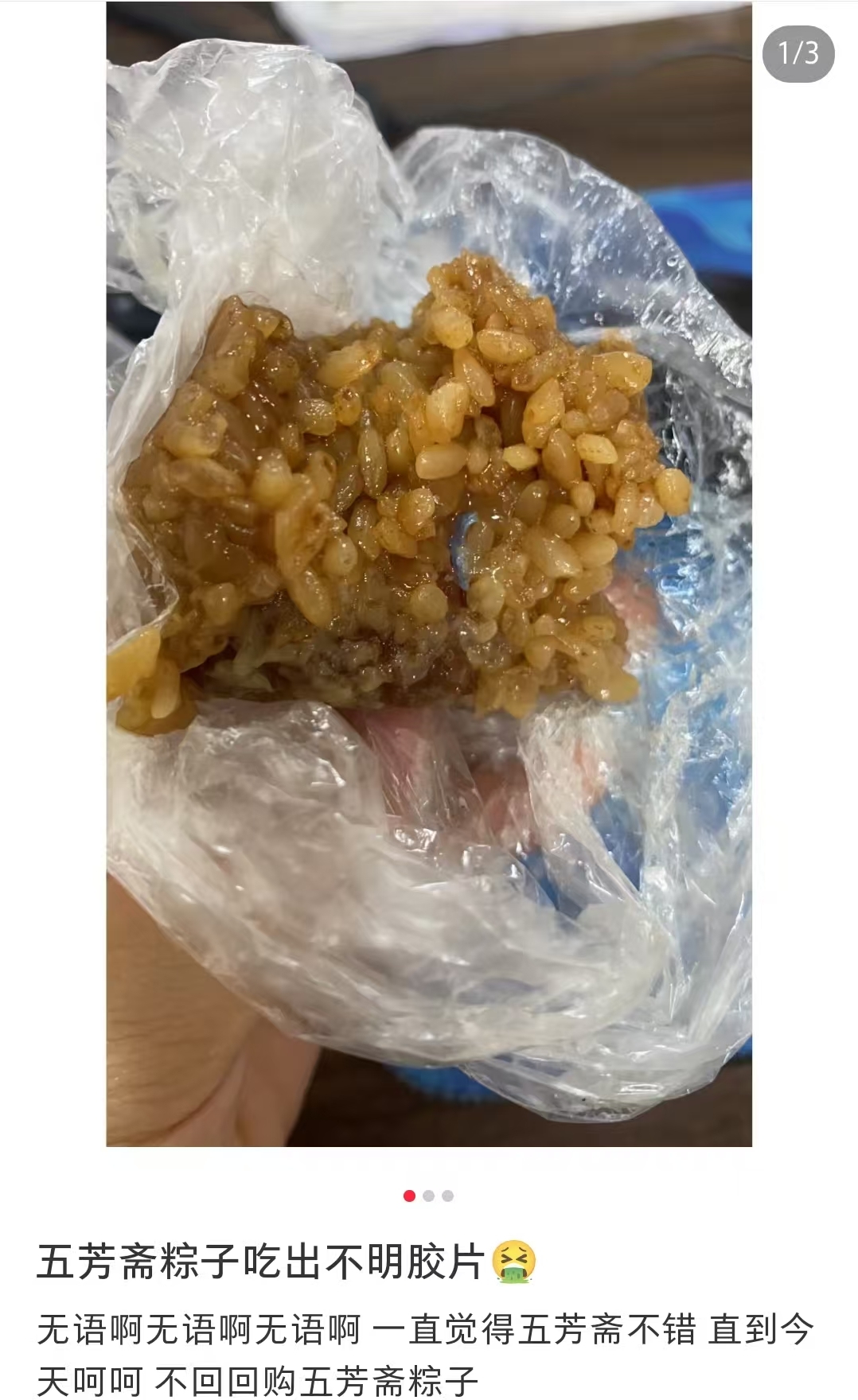 在社交平台上,关于五芳斋粽子的负面反馈不在少数,消费者的投诉几乎都指向了“肉眼可见的异物”,每一条都让人倒胃口。