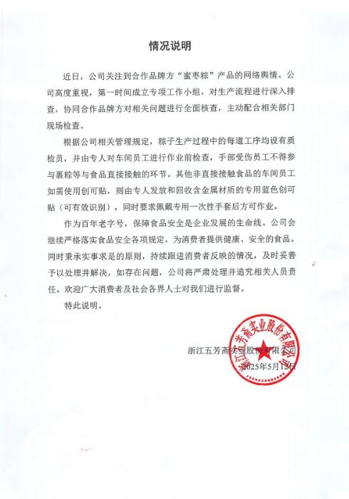 面对质疑,五芳斋在官网发布了一份情况说明,内容大致是“已第一时间成立专项小组,对涉事产品的生产流程进行全面排查,同时协同来伊份开展核查工作”。