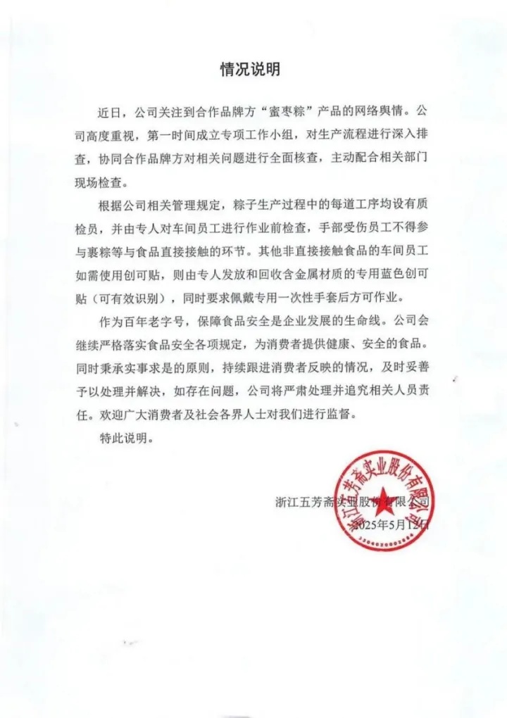 于是,面对质疑和“实锤”,5月12日晚,五芳斋在官网发布《情况说明》,称正在核查相关批次生产记录,并协同来伊份对相关问题进行全面核查,主动配合相关部门现场检查。
